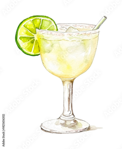 Refreshing margarita cocktail with lime garnish in elegant glass, cut out - stock png.