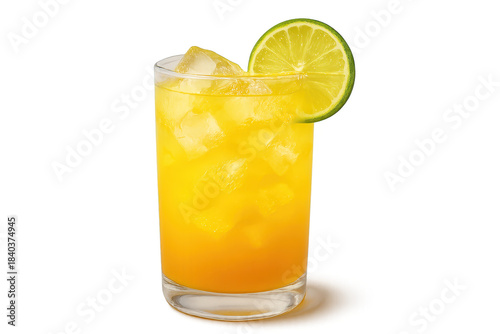 Refreshing orange drink with ice, lime slice, ideal for a transparent background.