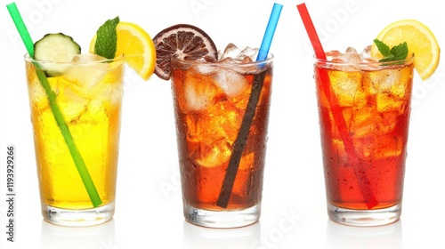 Refreshing Summer Beverages in Clear Glasses Featuring Various Ice Cubes, Fresh Fruits, and Colorful Straws for a Bright and Inviting Presentation
