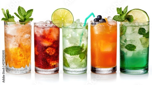 Refreshing summer cocktails, ice, mint, lime, fruits, white background, perfect for menu
