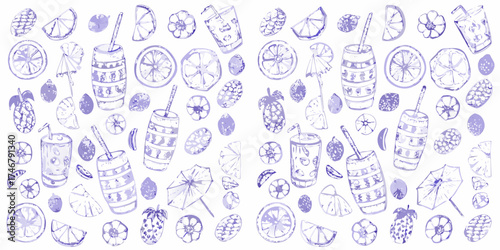 Refreshing summer drinks and fruits pattern with lemons limes and pineapples in purple