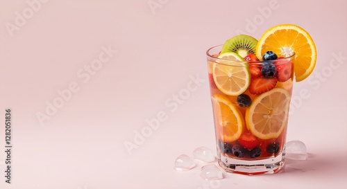 Refreshing summer fruit infused water in glass with citrus, kiwi, and berries. Healthy detox drink for hot days. Hydration and vitamin boost concept on pink background.
