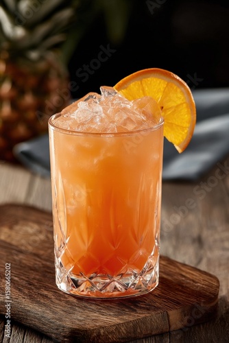Refreshing tropical cocktail with orange slice and crushed ice served in elegant glass on rustic wooden table outdoor setting