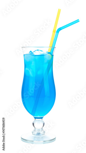 refreshment blue cocktail with ice and straw isolated on transparent background, png