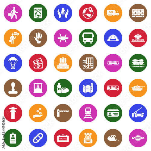 Refugee Icons. White Flat Design In Circle. Vector Illustration.
