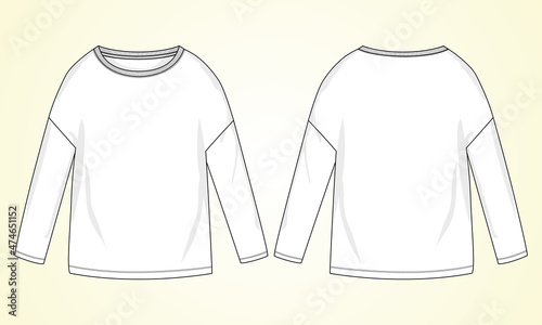 Relax fit Long Sleeve T-Shirt overall technical Fashion Flat Sketch vector template for Women's. Apparel design blank t shirt mock up front, back views isolated on white background. Easy editable.