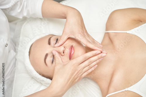 Relaxed female receiving facial massage in spa setting with calm expression and perfect skin.