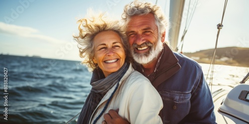 Relaxed of senior couple sailing luxury yacht. Generative AI.