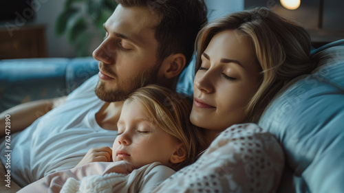 Relaxed young family resting and dreaming about new home on comfortable sofa together at home, happy young parents with little daughter relax enjoying nap relaxing or meditating.