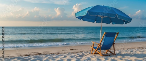 Relaxing Beach Scene with Portable Chair and Umbrella Under Blue Sky and Calm Ocean Waves