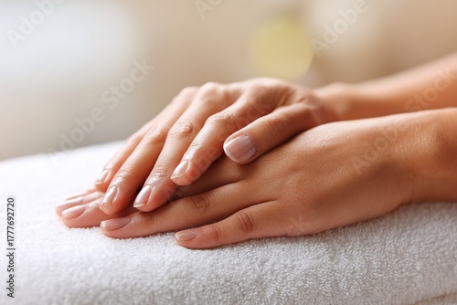 Relaxing hands on a soft towel at a peaceful spa setting for pampering and rejuvenation