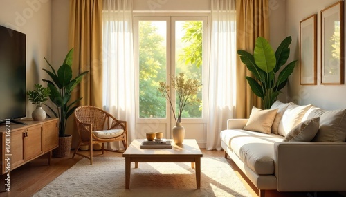 Relaxing in a cool, comfortable living room, sunlight streams through sheer curtains, highlighting the calm interior Perfect for summer comfort and home design , bright, interior design