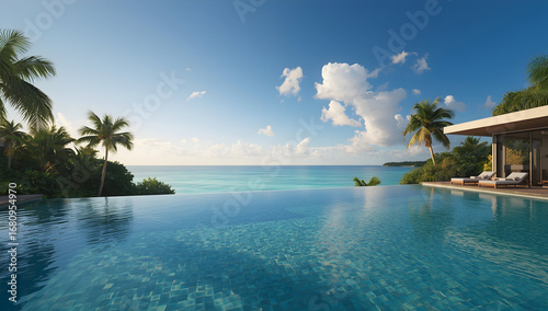 Relaxing poolside serenity overlooking ocean tropical paradise high-quality image scenic background