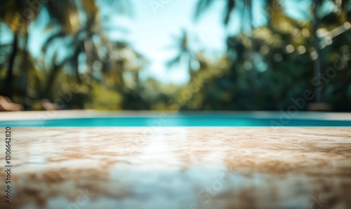Relaxing Poolside View with Palm Trees and Marble Surface