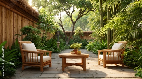 Relaxing tropical patio with bamboo furniture and lush greenery