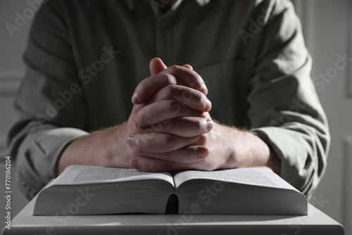 Religion. Christian man praying over Bible indoors, closeup
