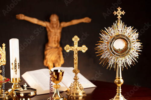 Religious holiday – Easter. Catholic symbols composition. Jesus figure, The Cross, monstrance, Holy Bible, rosary and golden chalice on gray background.