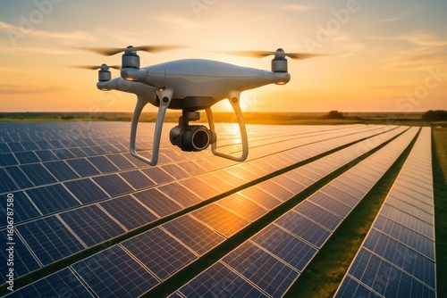 Renewable energy data center. Drone flying over solar panels at sunset, showcasing renewable energy technology.