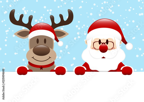 Rentier Und Weihnachtsmann Halten Horizontales Banner Schnee Blau Dunkelrot