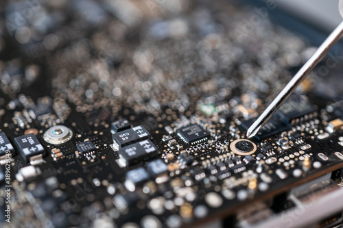 Repairing broken laptop computer mainboard, technician using screwdriver.