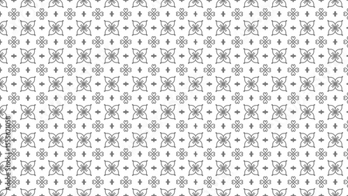 Repeating floral pattern with heart and cross shapes in a neutral gray on a white background design