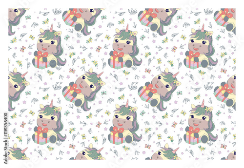 Repeating seamless pattern with adorable unicorn and cupcake. Design for printing on t-shirt, poster, banner. Beautiful print for t-shirt, shopper, notebooks, covers, posters and cards