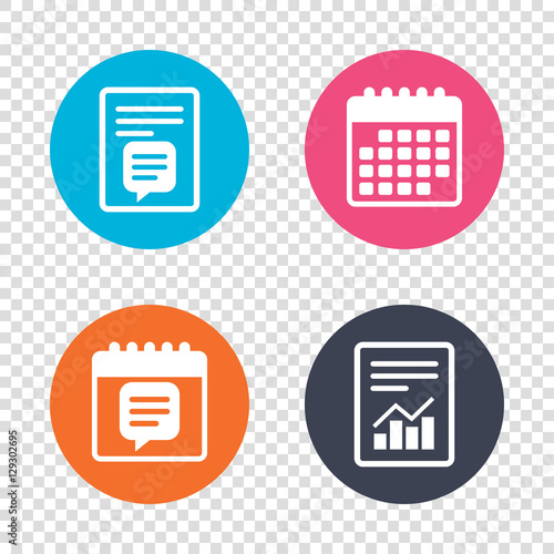 Report document, calendar icons. Chat sign icon. Speech bubble symbol. Communication chat bubble. Transparent background. Vector
