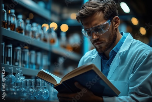 Researcher studies physics in laboratory surrounded by glassware and scientific equipment