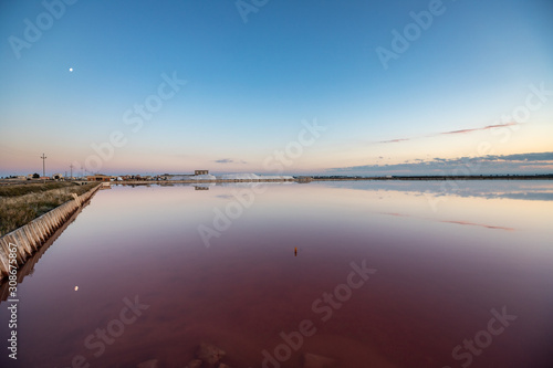 Reserve Saline Margherita di Savoia, Apulia, Italy: Salt flats (salt pan) area for salt production. Red waters colored by alga Dunaliella salina. salt mountains and the moon reflected in the marsh