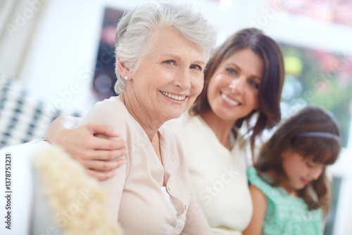 Rest, portrait and senior woman with family on sofa in living room for bonding together at home. Smile, relax and elderly person with daughter and grandchild for generations connection at house.