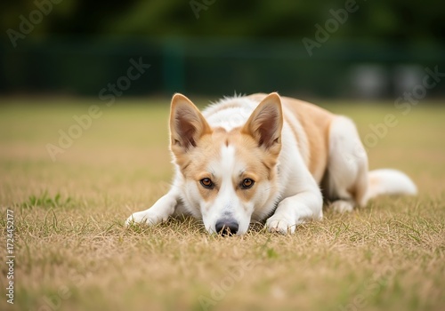Resting welsh corgi posing charmingly amidst the sun-drenched meadow