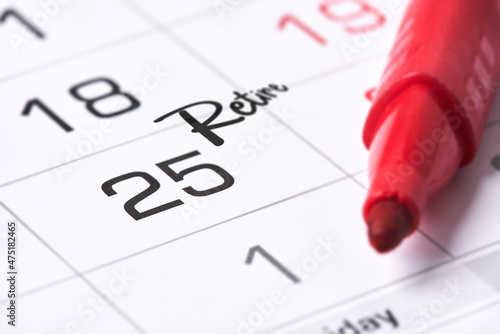 Retire concept with calendar. Close-up shot of calendar date with marked Retiring date. Last date of work. Retirement day marked on monthly calendar