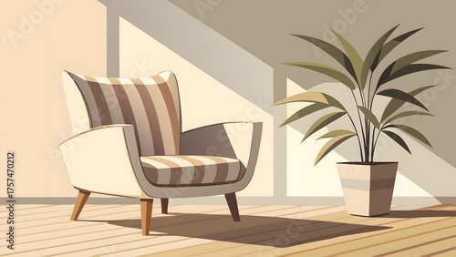 Retro Armchair and Potted Plant in Sunny Room Illustration