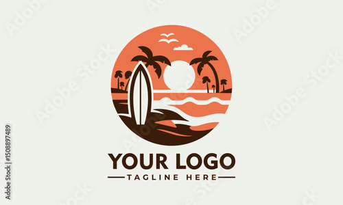 Retro beach scene with surfboard, palm trees, ocean waves, and sunset in circular design