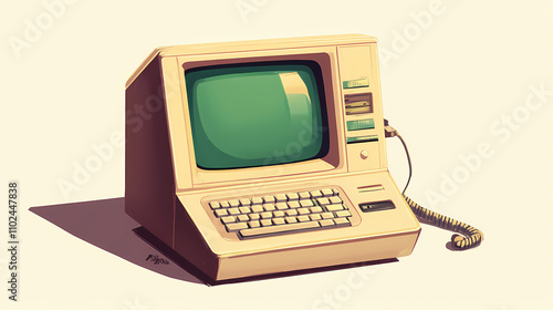 Retro beige computer with green text. Archaic. Illustration