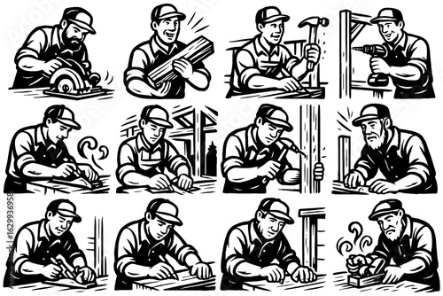 Retro construction workers using tools in various carpentry scenes, Transparent Background