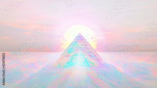 Retro Futuristic Vaporwave Landscape: Giant Pastel Sun and Wireframe Pyramid with VHS Glitch Effect