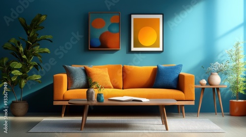 Retro living room with vintage furniture, bold colors, and a nostalgic 1970s vibe