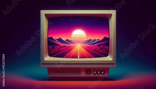 Retro Monitor Warm Colors 90's Style Poster with Sunset. Retro futuristic vibe background.