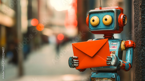 Retro robot holding red envelope in city street.