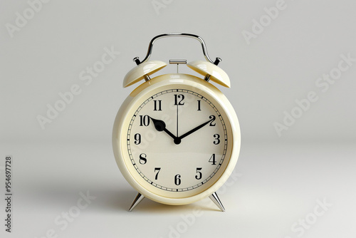 Retro style white alarm clock on white background with empty space. Generated by artificial intelligence