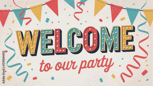 Retro welcome party banner with marquee letters and bunting