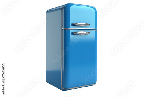 Retro-style blue refrigerator with chrome handles. Perfect for a kitchen decor, appliance store, or interior design themes.