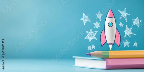 Returning to School: Books, Pencils, and Rocket Sketch.