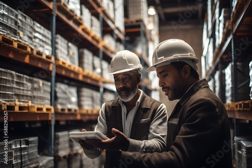 Revision managers discussing amount of loaded goods in racks. Generative ai. Warehouse, logistics workers. Business Storage.