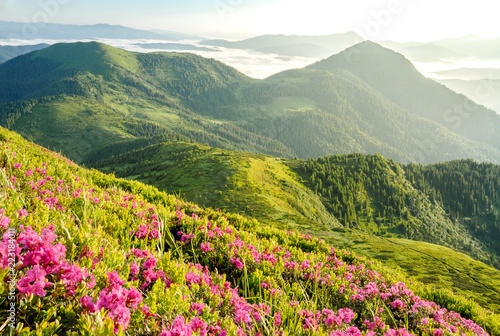 Rhododendron flowers on sun rise in Ukrainian Carpathian.