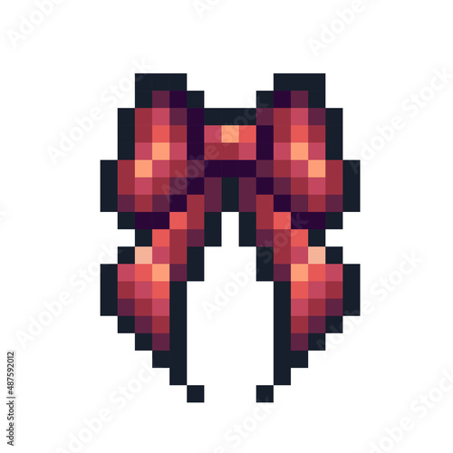 Ribbon pixel art icon. Present bow logo. 8-bit sprite. Decorative knot. Game development, mobile app. Isolated vector illustration