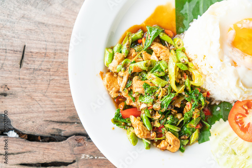 rice and stir fried chicken with basil and fried egg on top