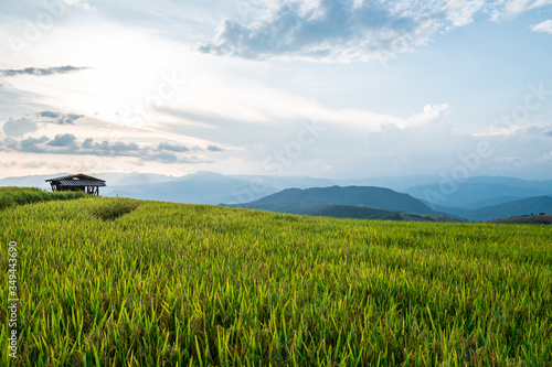 Rice terraces of hill tribe people in Mae Chaem District Chiang Mai is becoming golden, looks refreshing and relaxed.