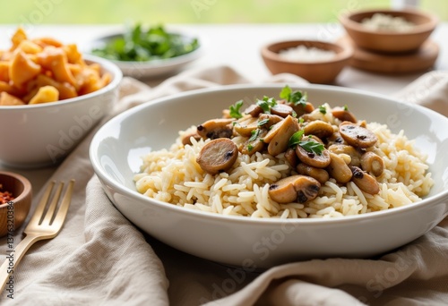 Rice with mushrooms and herbs in a bowl on a table